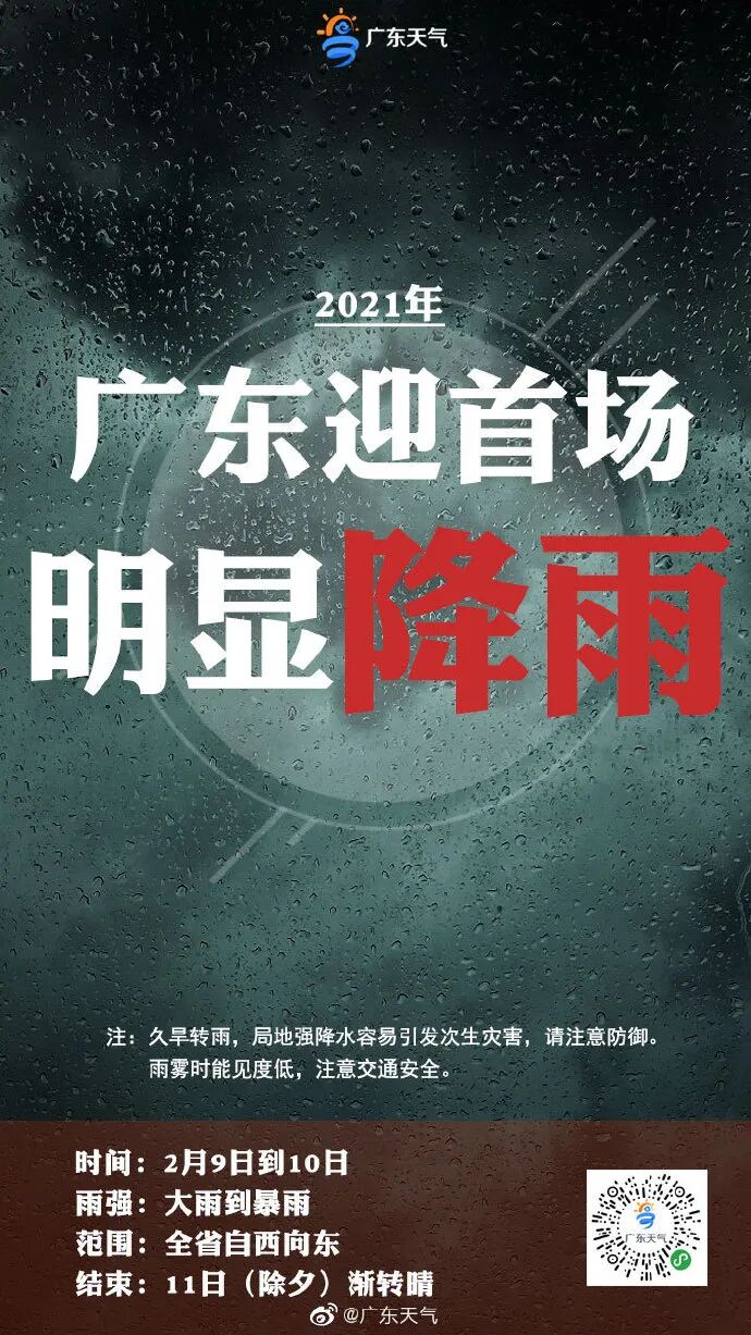预计9日-10日,受高空槽和低层东南气流影响,广东自西向东有大雨到暴雨降水;最高气温明显下降;11日降水趋于结束。