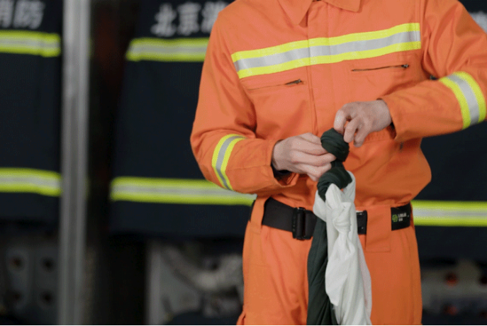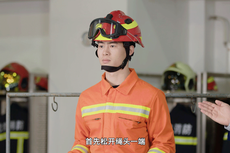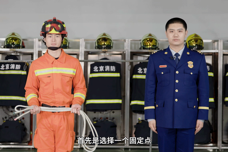2、使用逃生绳:在确保固定点牢固后,用消防逃生绳的一端行双绕双打结法。首先松开绳头一端,将消防绳绕固定支点两圈,随后短绳压长绳打个半结,再用短绳压长绳,打个半结,收紧,即为双绕双结。为增加消防逃生绳的阻力,可以在做连续单结:首先右手握紧绳头一端,左手反手握住长绳,内握成环,套过绳端,形成第一个单结。随后左手继续握住长绳,内握成环,套过第一个单结,形成第二个单结,依次操作后收紧,形成连续单结。